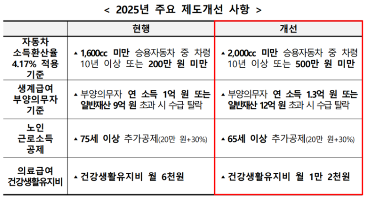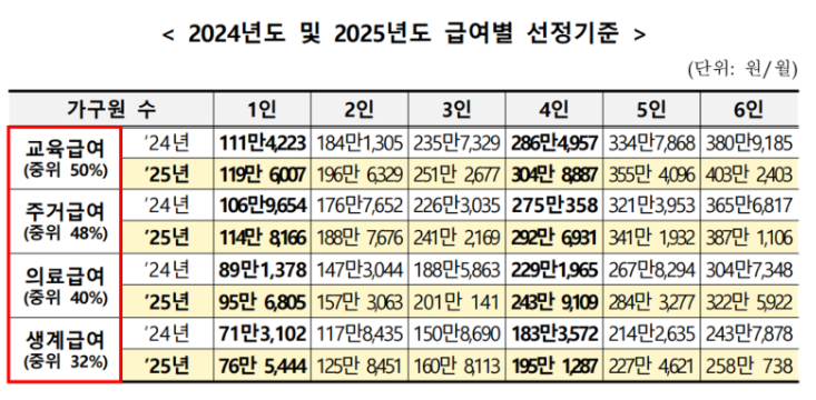 - 2025년부터 자동차 재산 기준이 완화되어, 2,000cc 이하 차량까지 포함되어 수급 자격이 확대되었습니다. 예를 들어, 월 소득 100만 원에 400만 원짜리 구형 차량을 보유한 가구도 수급 대상이 될 수 있습니다.