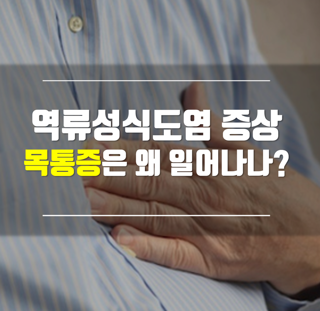 위산이 역류하여 인후점막을 자극하거나 염증을 일으켜 목이물감을 만들고 이런 것이 반복되면 목통증으로 이어지는 것이죠. 역류성식도염은 인후통이나 목쉼 현상 혹은 만성기침으로 나타나기도 합니다. 따로 이런 경우를 역류성후두염이라고 부릅니다.