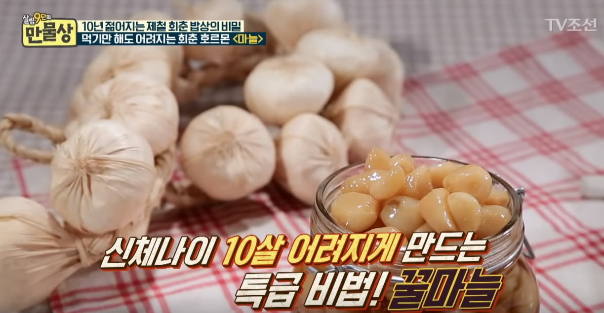 : 마늘 꿀절임은 몸속의 중금속을 배출해주어 몸의 노화를 막아준다고 합니다. 최근 한 방송에 출연한 70대 노부부가 화제가 되었는데요, 한 끼 3개씩 하루 3번 마늘 꿀절임을 먹어 신체나이 측정에서 동년배 평균 신체나이보다 10살이나 어리게 나왔다고하니, 노화 방지를 위해 마늘 꿀절임은 필수겠죠?