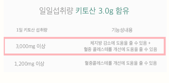 키토산은 혈중 콜레스테롤 개선 및 체지방 감소에 도움을 줄 수 있는 다이어트 기능성 원료로 확인되어 많은 분들이 다이어트 건강기능식품으로 많이 챙겨드시고 있는 것 같아요!